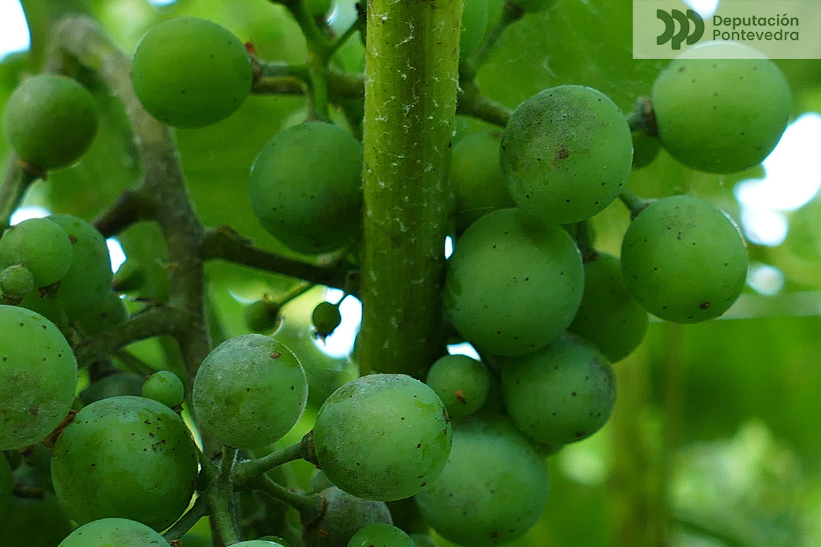 Na revisión desta semana só observamos síntomas en plantas testemuña sen tratamento algún, tanto en acios que aínda non entraron no pintado como en rebuscos e en folla. Nas plantas tratadas non os atopamos, nin nas de variedades máis sensibles. Do mesmo xeito co patóxeno responsable do mildio, o fungo causante do oídio non pode danar ás uvas despois do pintado pero atención: ambos organismos poden afectar ao raque do acio ata a vendima.