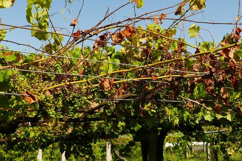 Con esta situación, e os acios xa practicamente na súa totalidade no pintado e en fase de maduración, na revisión desta semana practicamente non vimos síntomas e só temos que falar dalgúns en novos crecementos de plantas máis afectadas de mildio (poucos), e de cepas testemuña e/ou abandonadas, aínda que non se observaron en todos os casos, nin tampouco nos rebuscos, que aínda serían susceptibles. Aparte da menor humidade ambiental e da ausencia de choivas a esta situación puideron contribuír tamén as temperaturas elevadas, que conforme van subindo van diminuíndo a capacidade xerminativa dos esporanxios. Iso si, a defoliación por mildio nas partes máis altas das parras continuou a producirse.
