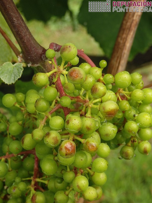 Tamén observamos viñas que sen dúbida arrastran síntomas desde hai tempo, nas que polo tanto non se logrou un bo control das infeccións cos tratamentos aplicados, con abundantes manchas nos crecementos e acios afectados en boa parte da súa superficie.