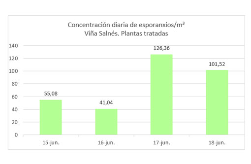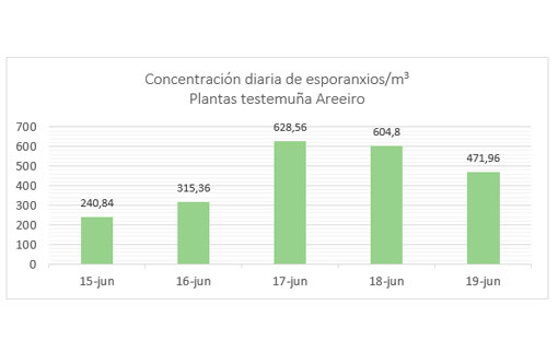 Como ben é sabido, esta semana choveu practicamente todos os días, con precipitacións que non foron dunha contía moi elevada pero que si foi mantida ao longo das horas, de xeito que a humidade relativa do aire estivo ben alta, con medias de 80-100% cada un dos días transcorridos desde o pasado venres día 14, e incluso tamén os dous últimos días sen apenas precipitación. Amais, as temperaturas finalmente foron suaves, e nas primeiras horas sen luz algunhas xornadas mantivéronse incluso na contorna dos 16-17ºC, moi propicias para a frutificación do fungo. Deste xeito, o captador da nosa parcela de Areeiro, situado nas plantas testemuña, recolleu unha cifra moi alta de esporanxios, sobre todo o 17 e o 18 (máis de 600/m3 de aire), e o mesmo o situado no Salnés, que está nunha viña tratada pero na que xa estaba a concluír o período de protección teórico do tratamento anterior.