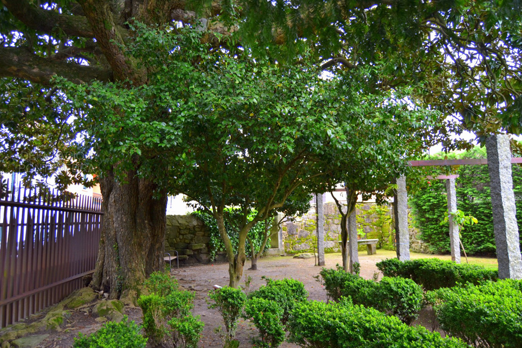 O camiño, que rodea a casa e vai cara á praciña do castiñeiro, chamada así polo exemplar plantado en 1970 —de gran porte e bo estado de conservación—, na que medran tamén dúas camelias (Camellia japonica), tres fentos arbóreos australianos (Sphaeropteris cooperi), unpitósporo (Pittosporum tobira), unha espirea do Xapón (Spiraea cantoniensis), agapantos (Agapanthus praecox) e calas (Zantedeschia aethiopica).