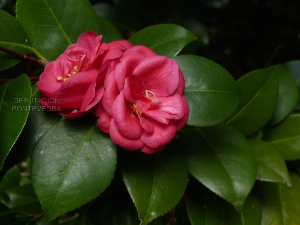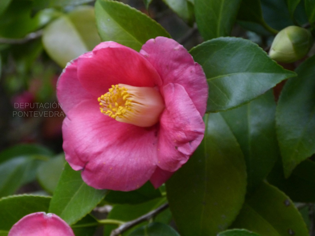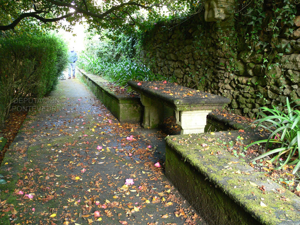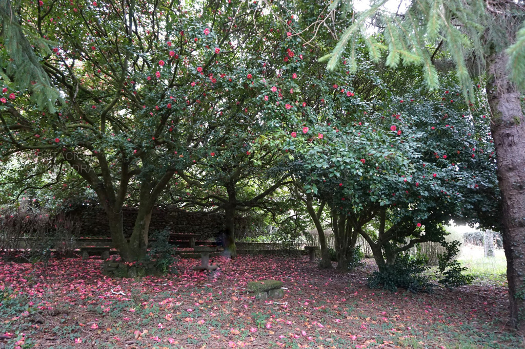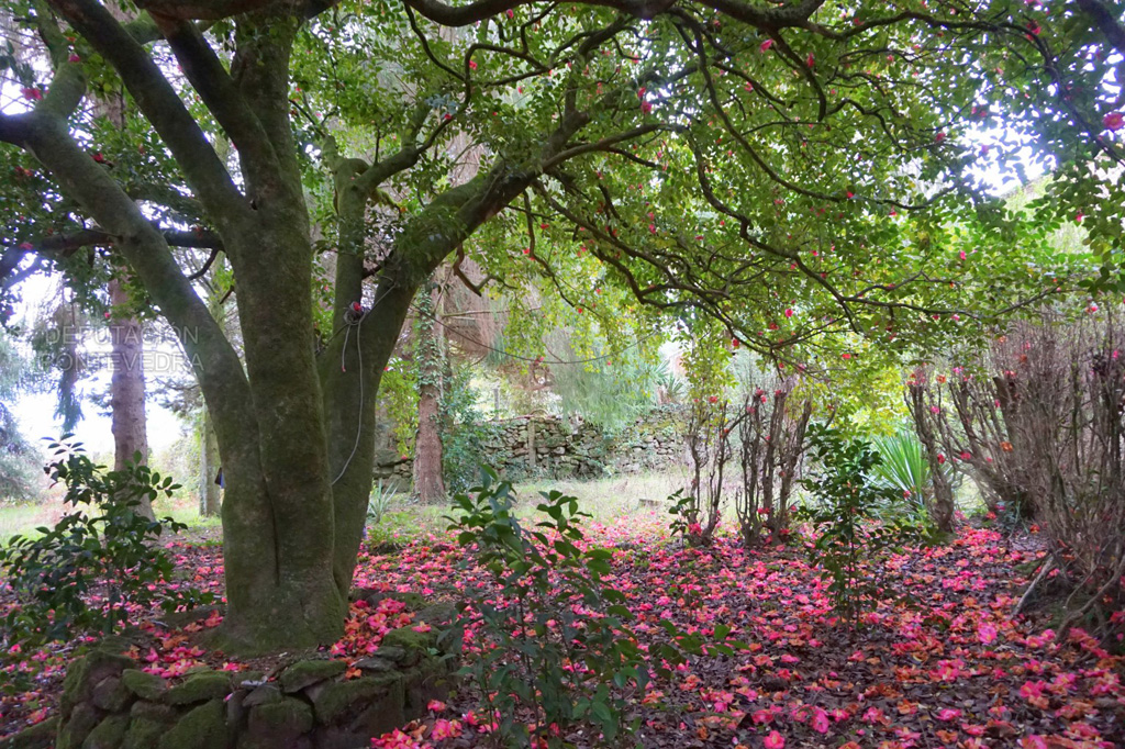 Próximo á vivenda hai un pequeno xardín no que medran seis exemplares antigos de camelia xapónica, un recuncho con moito encanto que en época de floración loce un chan cuberto de pétalos rosados que semella unha alfombra.