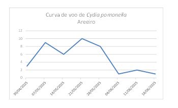 No boletín anterior falabamos de que baixara sensiblemente o número de machos capturados na trampa de Areeiro e de que tamén baixara a cifra dos recollidos en Pontecaldelas, apuntando a que a semana anterior se producira o pico de voo. Pois ben, os datos desta semana confirmaron este feito na de Areeiro, onde se recolleron 2 machos fronte aos 7 anteriores (ver curva de voo), pero non así na de Pontecaldelas, onde aínda esta semana se produciu un incremento significativo de capturas: dos 7 da semana anterior aos 30 desta. En realidade, neste concello a trampa leva pouco tempo instalada e non se recollera un número elevado de adultos ata a actualidade (30 machos).
