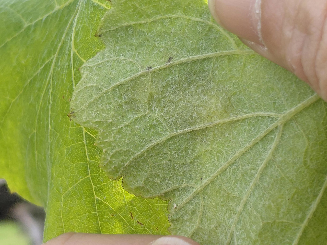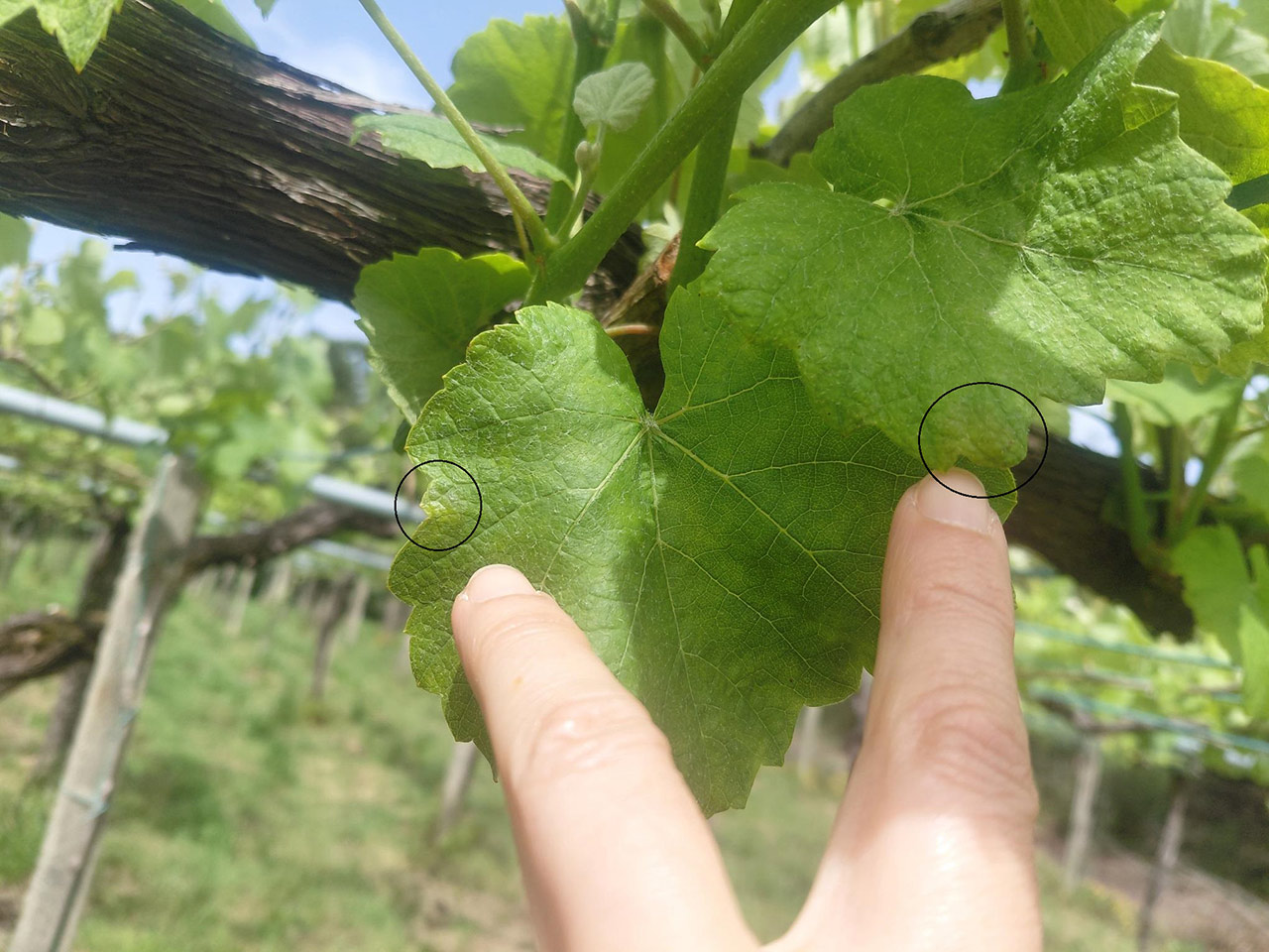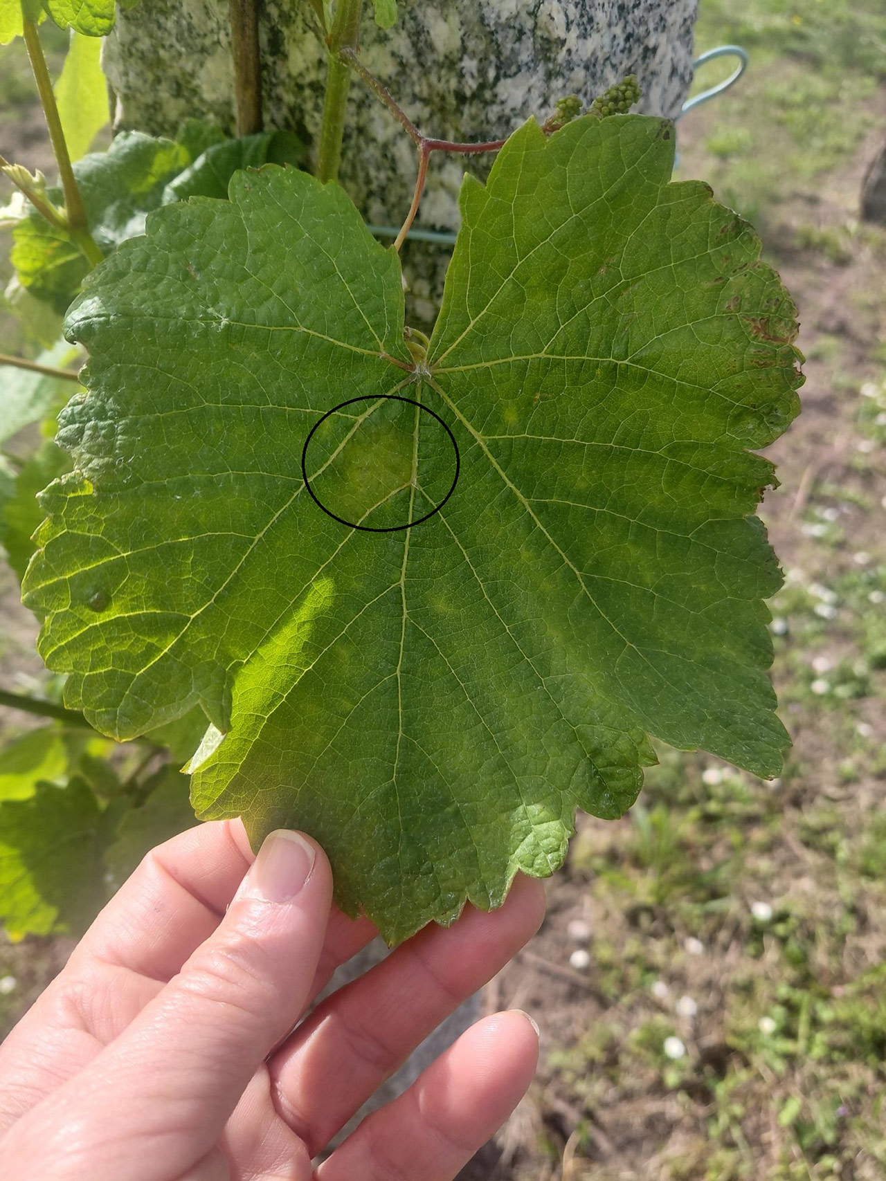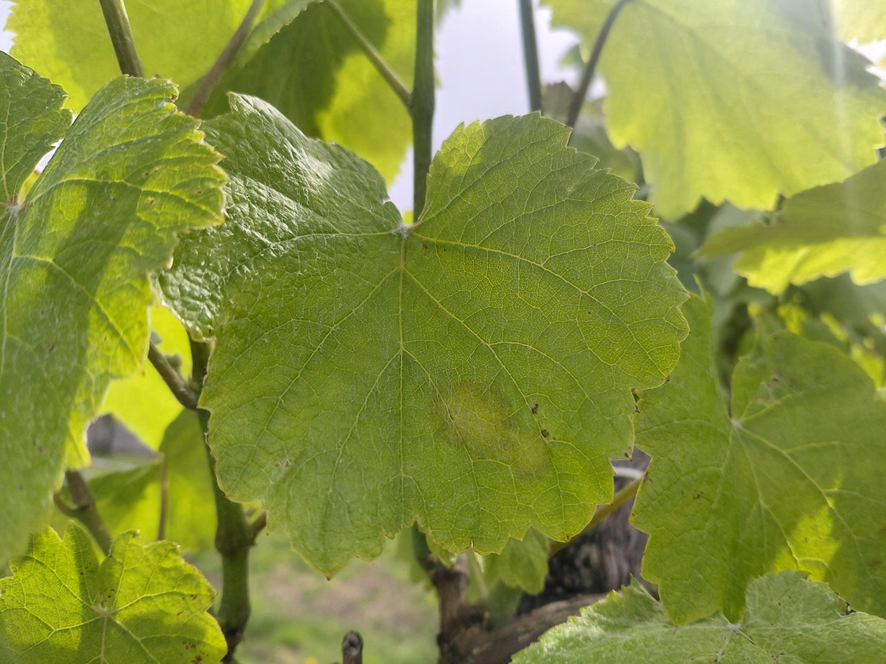 Como se pode ver nas imaxes, as manchas non eran de todo incipientes ao apreciarse con claridade, aínda que en xeral non amosaban frutificación, pero nunha viña de Sanxenxo si eran incipientes e polo tanto difíciles de visualizar.