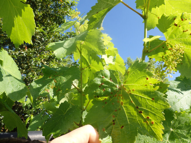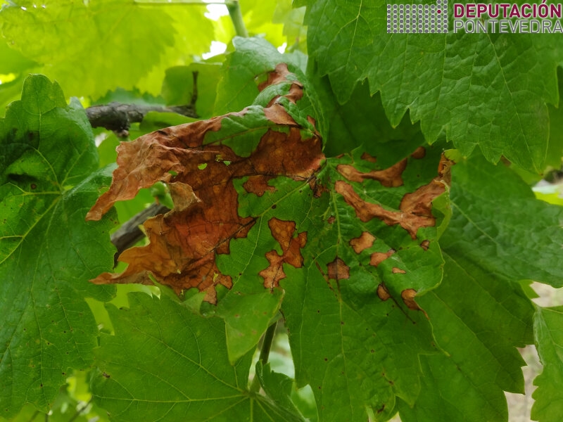 Con todo, nun predio de O Rosal observamos unha maior presenza de síntomas, e nesa viña en concreto había danos en acio que afectaban ao 5% do conxunto. Dáse a circunstancia de que nese predio o desenvolvemento da vexetación é excesivo e a súa situación bastante pechada, co que é complicado que teña ventilación.