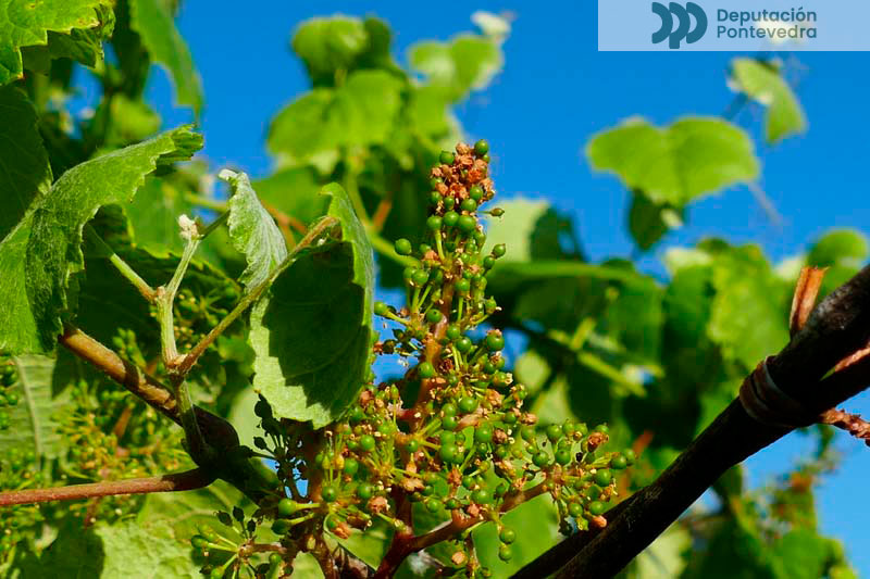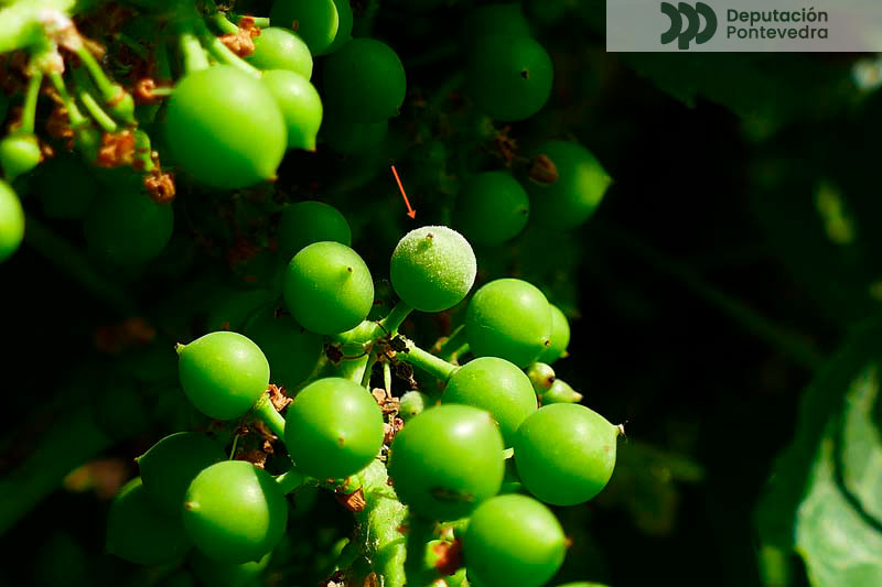 Con todo, na revisión desta semana ás nosas parcelas de seguimento e a outras que visitamos ao azar non atopamos situacións graves no que a síntomas se refire, máis ben ao contrario, consideramos que debido a que a maioría dos predios recibiran un tratamento antimildio xusto antes de que se iniciara o episodio tormentoso e/ou fixeran labores de despuntado máis esfolla, que eran moi necesarias. É certo que nalgún caso observamos, onde xa se levaba arrastrando unha infección mal controlada, algún acio disperso cuns grans con frutificación así como algunha mancha non ben curada.