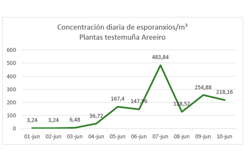Finalmente, o episodio tormentoso que estaba previsto para a fin de semana pasada, e que xa tivera as súas primeiras manifestacións desde xoves ou venres deixou choivas repartidas moi irregularmente tanto en cantidade (desde máis de 30 l/m2 ata practica ausencia de precipitación) como en tipo (desde choiva tipo orballo ata sarabia intensa). O que si foi coincidente en todas as comarcas foron as temperaturas mínimas elevadas, neste caso non só ao longo da fin de semana, cando nalgunhas zonas non baixaron de 18-19ºC, senón tamén durante toda a semana. Como sabemos, estas condicións unidas a unha elevada humidade son moi favorables ao patóxeno, e así se reflectiu no número de esporanxios recollidos no captador que temos instalado nas plantas testemuña da nosa viña de Areeiro, que non ten próximos outros predios deste cultivo.