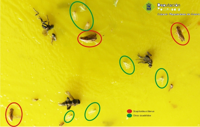Porén, segue a ser necesario aplicar tratamentos na zona sur da provincia para reducir na medida do posible as poboacións de Scaphoideus titanus, o cicadelido vector da flavescencia dourada, do que se seguen a recoller bastantes adultos nas trampas. Esta é unha medida imprescindible para tentar limitar o avance da flavescencia e por iso non debe descoidarse, amais de eliminar e destruír as plantas abandonadas e de prestar moita atención a onde se compren as plantas que se teñen que repoñer nunha plantación por exemplo.