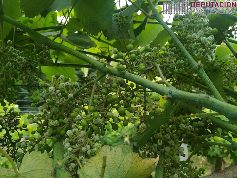 Tamén naquelas viñas abandonadas onde observamos os síntomas de oídio en acio, así coma noutras de diferentes comarcas, apareceron esta semana bastantes síntomas nos grans. Nas sometidas a tratamentos non observamos ningún, e nas follas só moi puntualmente, pero debido a que se prevé a continuidade das choivas, calquera intervención antimildio e/ou antioídio debe ser realizada con funxicidas que tamén estean rexistrados para usar fronte a esta enfermidade.