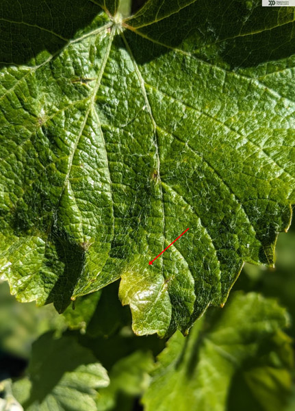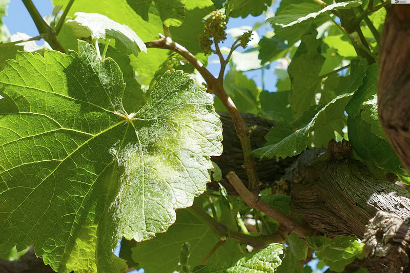 As previsións meteorolóxicas anuncian choivas a partir de mañá xoves día 25, aínda que acompañadas dun descenso significativo das temperaturas máximas e mínimas pola entrada dunha masa de aire polar na nosa comunidade. Debido á proximidade das precipitacións, onte martes fomos revisar a nosa viña de Areeiro e atopamos a primeira mancha de mildio. A mancha era moi pequena, estaba situada nun bordo da folla e só separándoa da planta e mirándoa á lupa binocular puidemos confirmar que efectivamente o era, pois tiña un inicio moi lixeiro de frutificación.