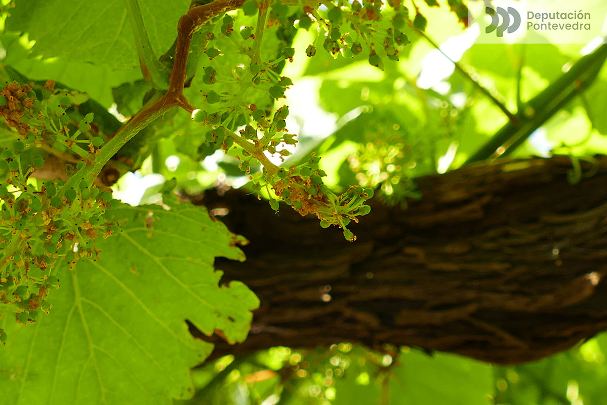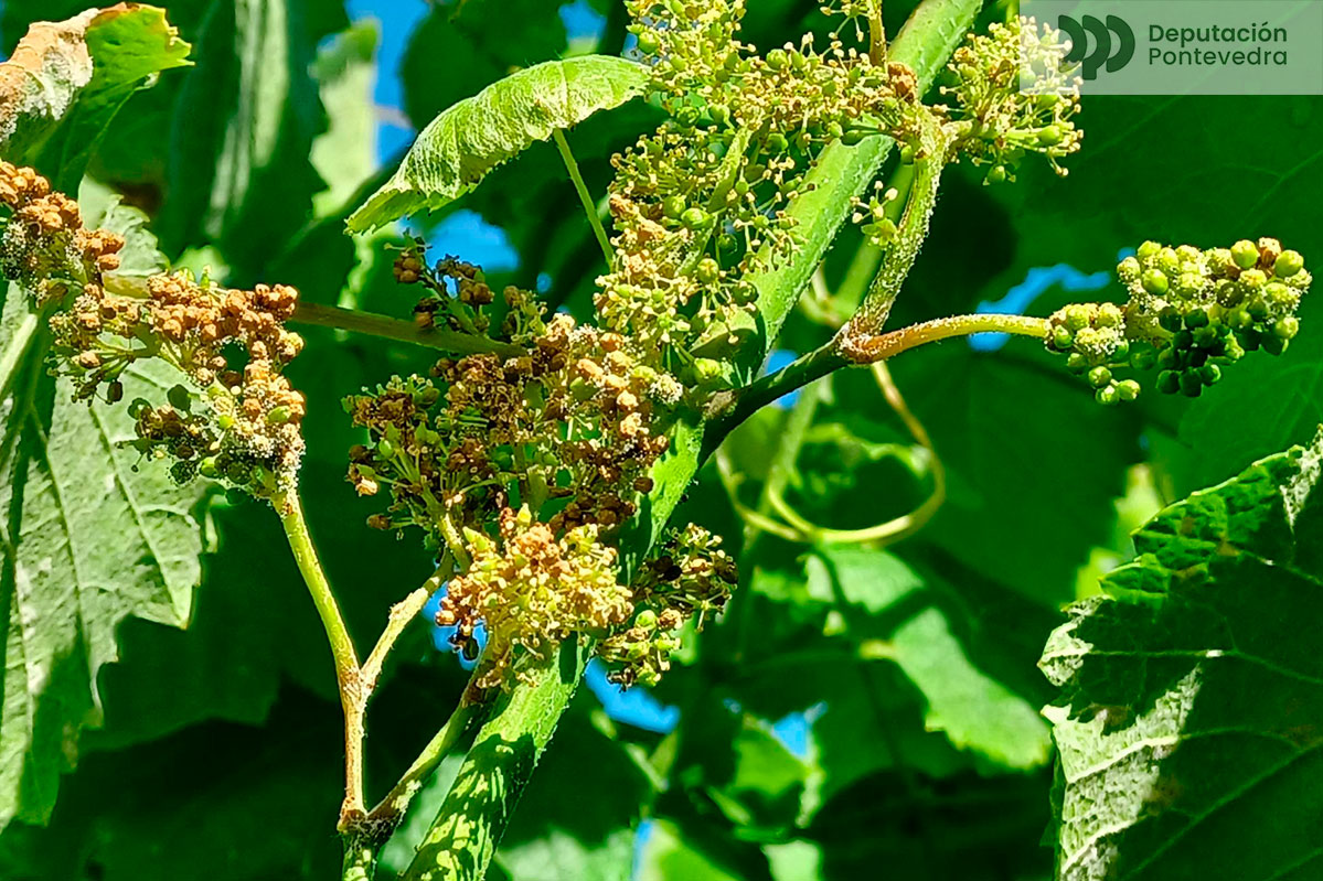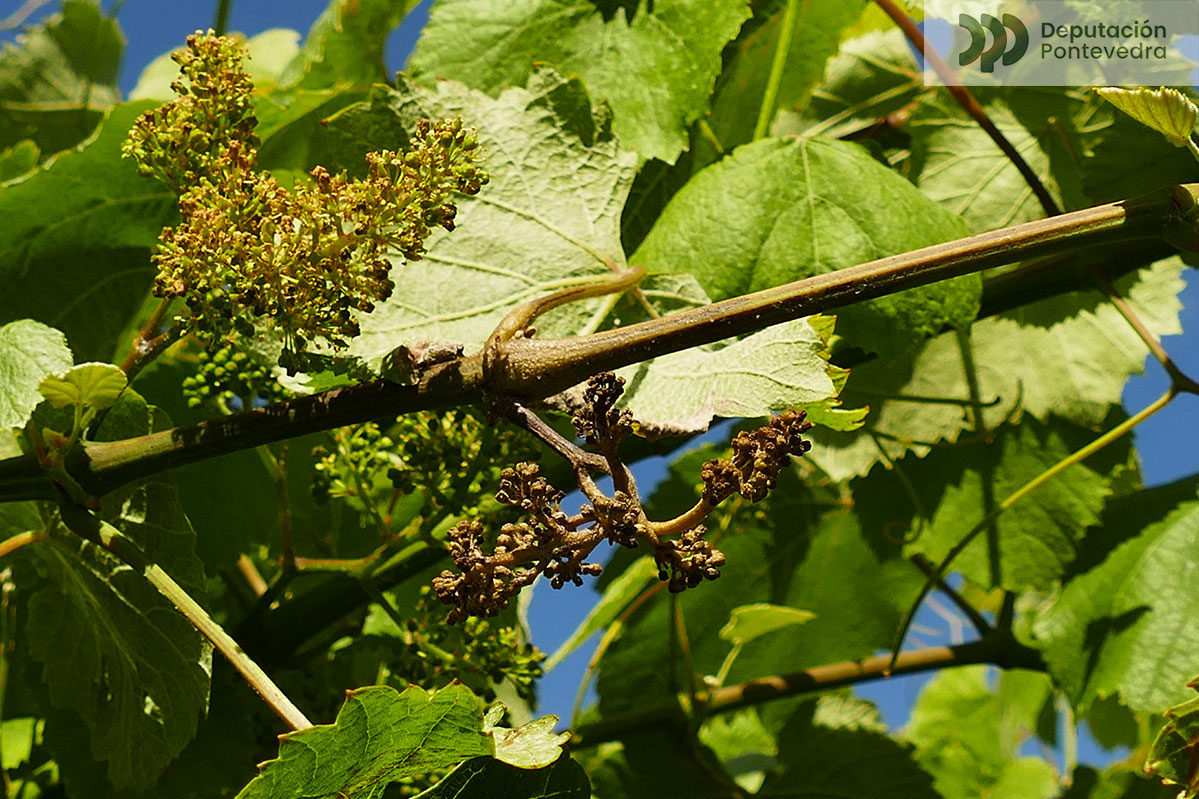 Continúa a fenoloxía heteroxénea á que nos estamos a referir nas últimas semanas pero, o tempo seco que xa temos e que se prevé continuará nas próximas xornadas axudará a superar a floración sen problemas e posiblemente tamén a que a fenoloxía se iguale, cando menos dentro de cada predio. Tamén xa se empezan a observar os primeiros acios de albariño coa uva formada nalgúns casos.