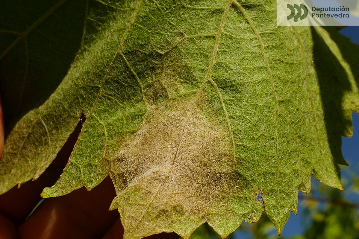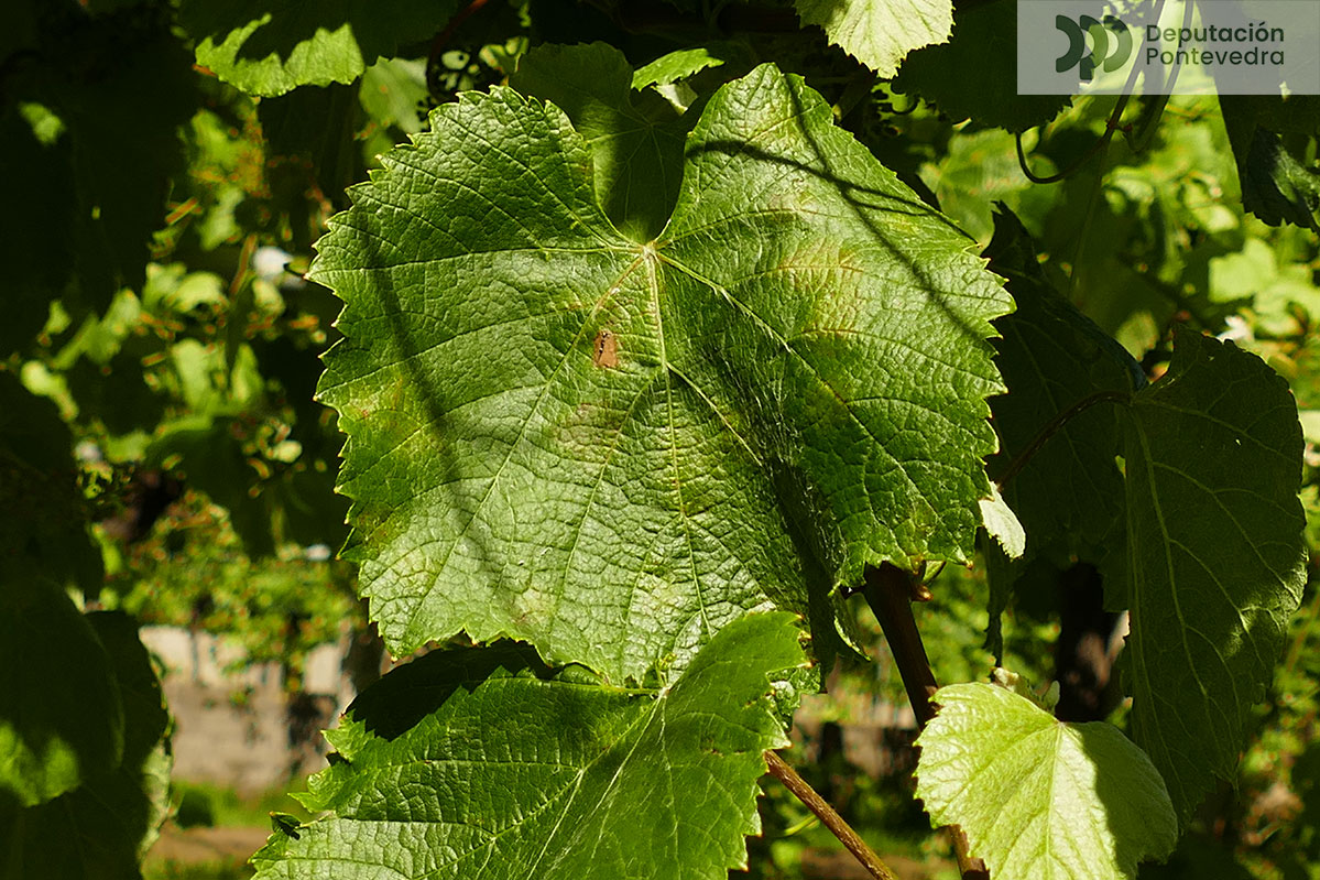 En albariño non topamos aínda ningún síntoma do patóxeno malia ter dúas parcelas con zonas altamente sensibles ao fungo. Non obstante, facendo outro traballo esta semana vimos unha viña dunha variedade diferente no que si se vía a característica frutificación do patóxeno. É preciso incrementar a vixilancia.