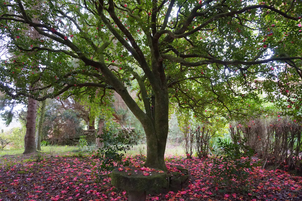 Próximo a la vivienda hay un pequeño jardín en el que crecen seis ejemplares antiguos de camelia japónica, un rincón con mucho encanto que en época de floración luce un suelo cubierto de pétalos rosados que parece una alfombra.