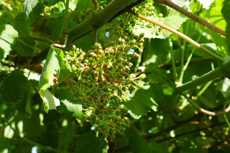 Como xa dixemos no boletín anterior, estamos nun momento decisivo para a futura colleita, pois os grans dos acios que se veñen de formar son moi sensibles ao mildio. Ademais disto, desde a noite do día 3 ou a madrugada de onte día 4 hai precipitacións que viñeron a complicar a climatoloxía e, segundo as previsións das diferentes axencias meteorolóxicas consultadas, a curto prazo continuará habendo certa posibilidade de choivas con temperaturas normais para a época do ano pero previsiblemente o domingo entrará unha masa de aire cálido desde o norte de África que fará subir as temperaturas ata 10 graos por riba do normal e o tempo se estabilizará para volver a inestabilizarse desde metade da semana pola posible influencia dunha  DANA. Con esta situación, e ante o momento tan susceptible no que nos atopamos, a nosa recomendación é loitar fronte ao mildio combinando o uso de produtos funxicidas con efecto curativo e antiesporulante coas labores culturais de roza da vexetación acompañante e, en especial naqueles predios onde xa houbo ou hai focos de infección activos, tamén coa eliminación de netos, o despunte das ramas e mesmo algunha esfolla lixeira para favorecer a aireación e a penetración do caldo fitosanitario no dosel da viña.