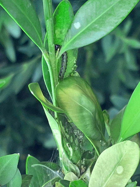 Esta semana capturamos 8 machos nunha das trampas de Areeiro, e atopamos algunha posta nova e igualmente unha eiruga xa bastante desenvolvida. Incrementar a vixilancia, pois sabemos que esta praga pode defoliar completamente o buxo en poucos días se as condicións ambientais e de alimento a favorecen.