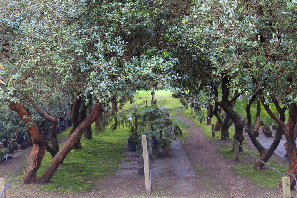 En la terraza anexa a la casa principal se encuentra una hermosa pérgola con estructura de hierro forjado típica del siglo xix (cubierta en la actualidad con ejemplares de Camellia sasanqua con una mesa octogonal de piedra ubicada en el interior. Comparte espacio con cuatro magnolias (Magnolia grandiflora), dos acerolos (Crataegus azarolus) y una camelia (Camellia japonica) de flores color rosa tipo Oranda-kô. Todos los ejemplares son de avanzada edad y presentan un buen porte.