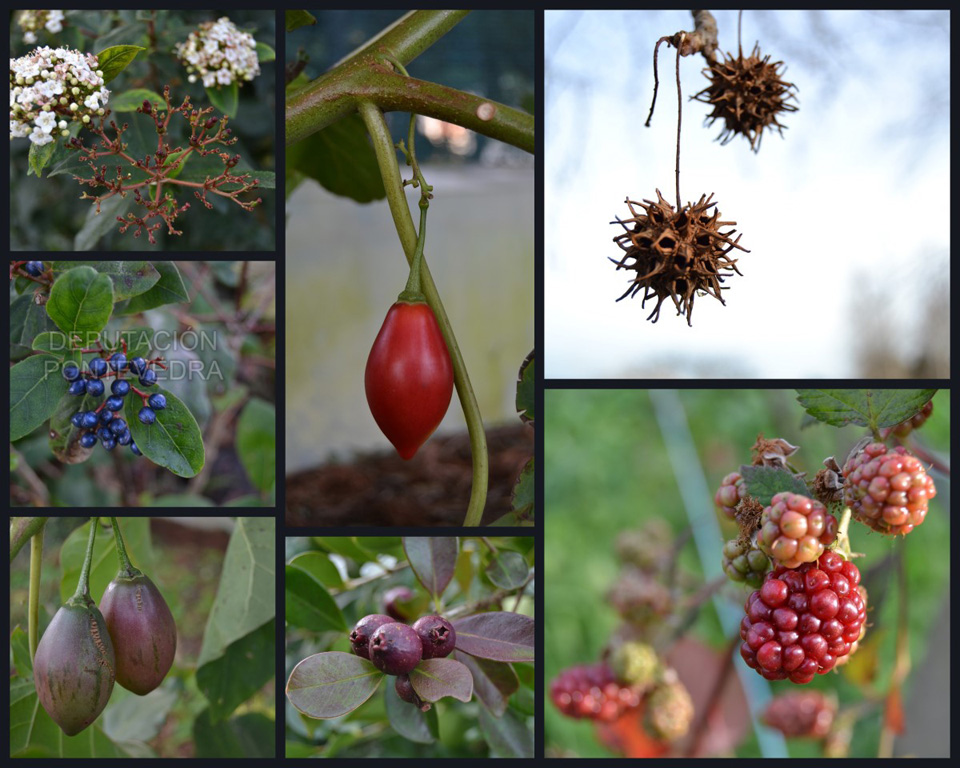 Incluye feijoas (Acca sellowiana), guayabo fresa (Psidium cattleianum), kiwi (Actinidia deliciosa), kiwiño (Actinidia arguta), oliva de otoño (Elaeagnus umbellata), cerezos (Prunus avium), moreras (Morus alba), manzanos (Malus domestica), perales (Pyrus communis), vid (Vitis vinifera) de uva albariña, mirabeles (Prunus domestica ‘Syriaca'), aguacates (Persea americana), nogales (Juglans regia), avellanos (Corylus abela), limoneros (Citrus x limon), membrilleros (Cydonia oblonga), nísperos (Eriobotrya japonica), castaños (Castanea x courdecii), mandarinos (Citrus reticulata), un naranjo (Citrus x sinensis), higueras (Ficus carica), caquis (Dyospiros kaki), acerolos (Crataegus azarolus), arándanos (Vaccinium myrtillus), granados (Punica granatum) y madroños (Arbutus unedo).