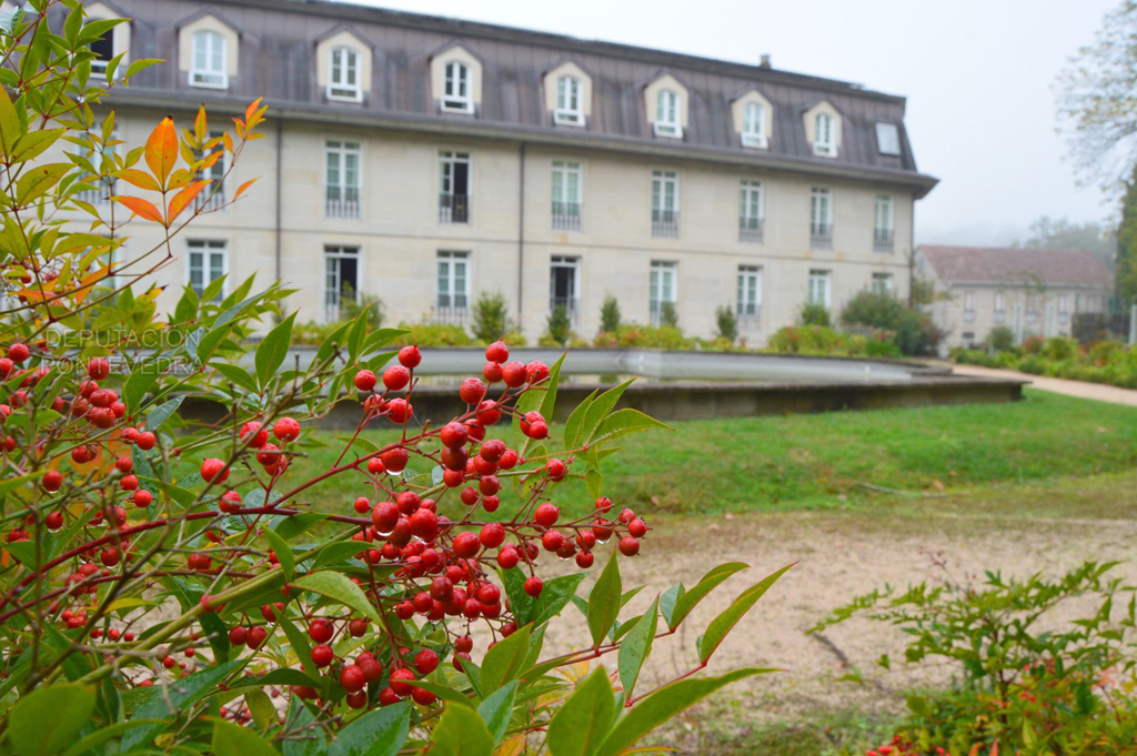 La entrada al parque, tras el edificio, se hace por su parte oeste. Pasamos al lado del regato, canalizado por muros de una piedra y que discurre por la vaguada, y en el extremo oeste de la parcela se ven los restos de la antigua lavandería del Gran Hotel.