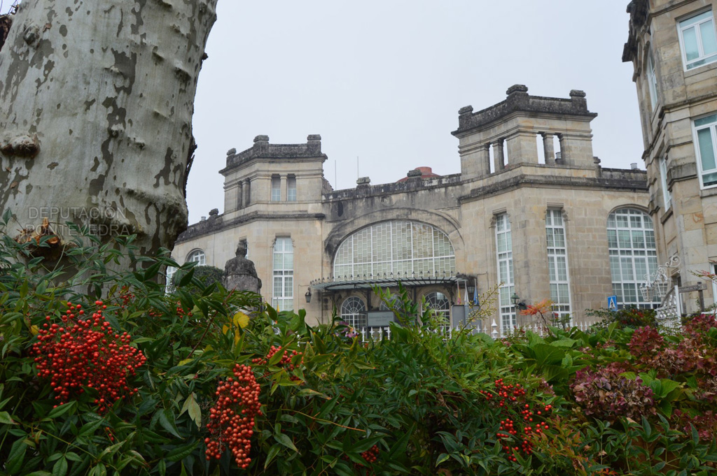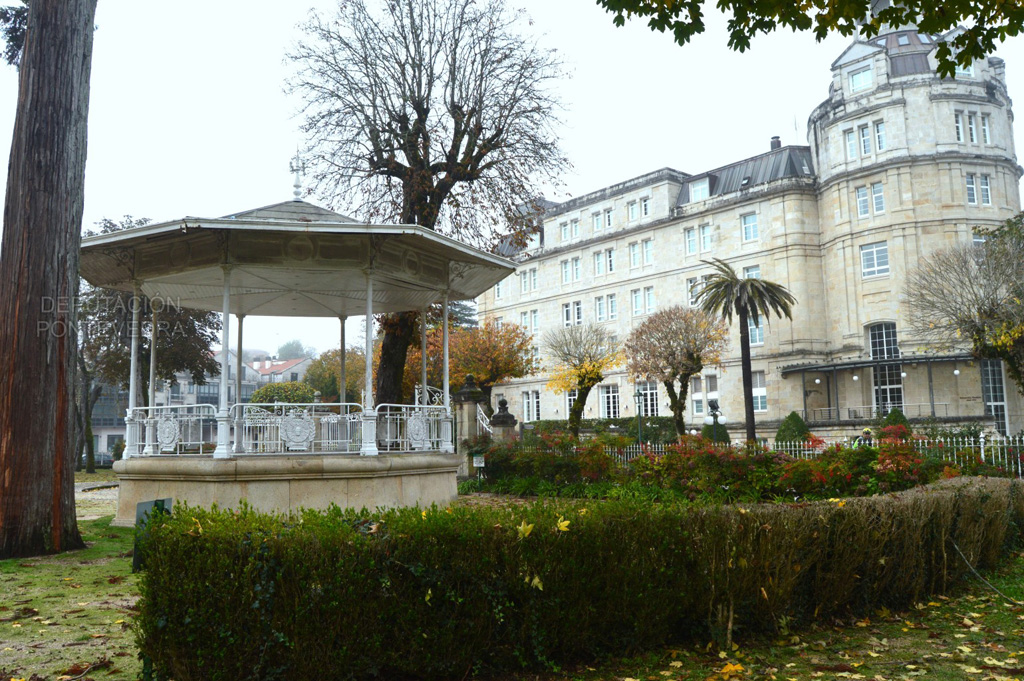 Delante de la fachada del edificio del antiguo hotel se dispone una amplia explanada con algunos árboles y arbustos, donde destacan los plátanos de sombra (Platanus x acerifolia) podados y una gran criptomeria (Cryptomeria japonica) de 30 m de altura y 3 m de perímetro a la altura del pecho. Llama también la atención el palco de la música de sección octogonal sito en la parte norte, junto a la criptomeria. Un vallado metálico y un seto separan este espacio de la avenida de Mondariz que discurre contigua.