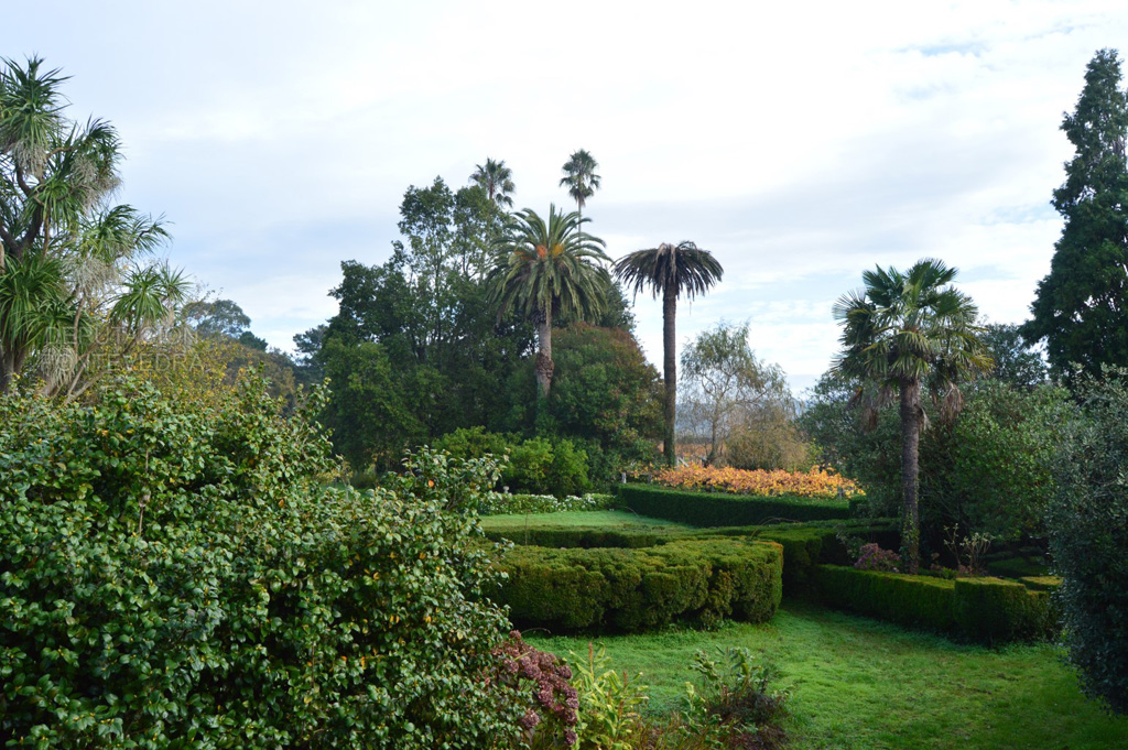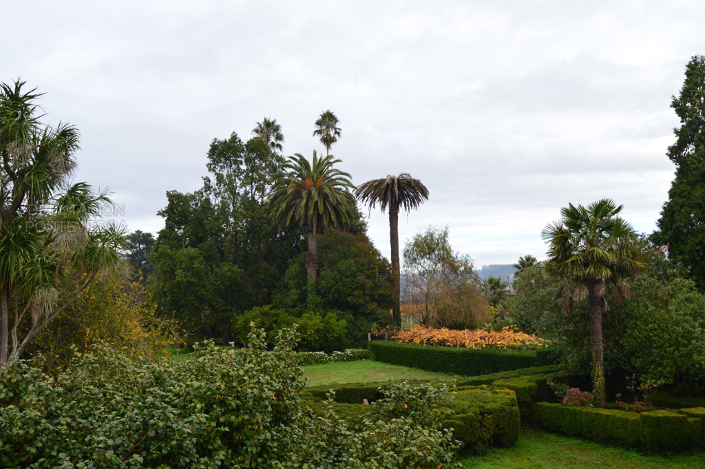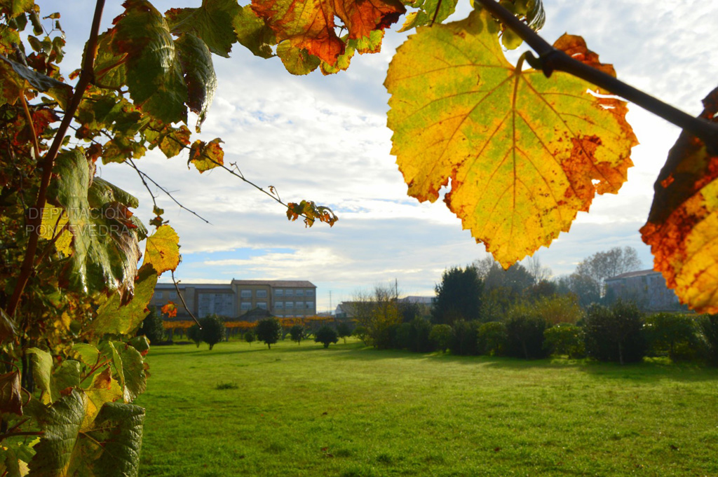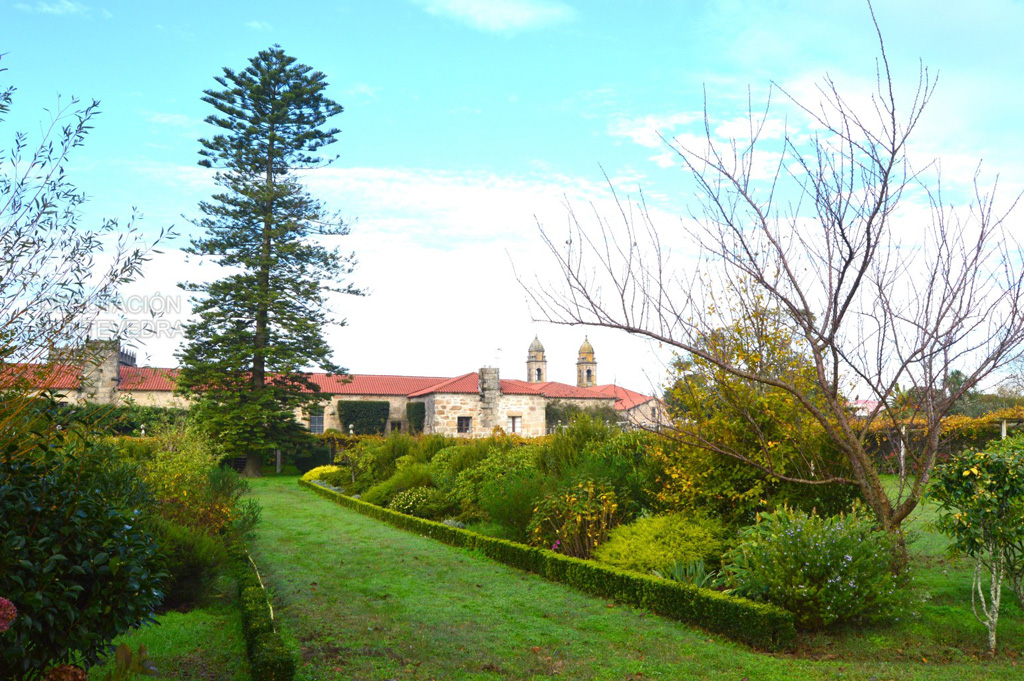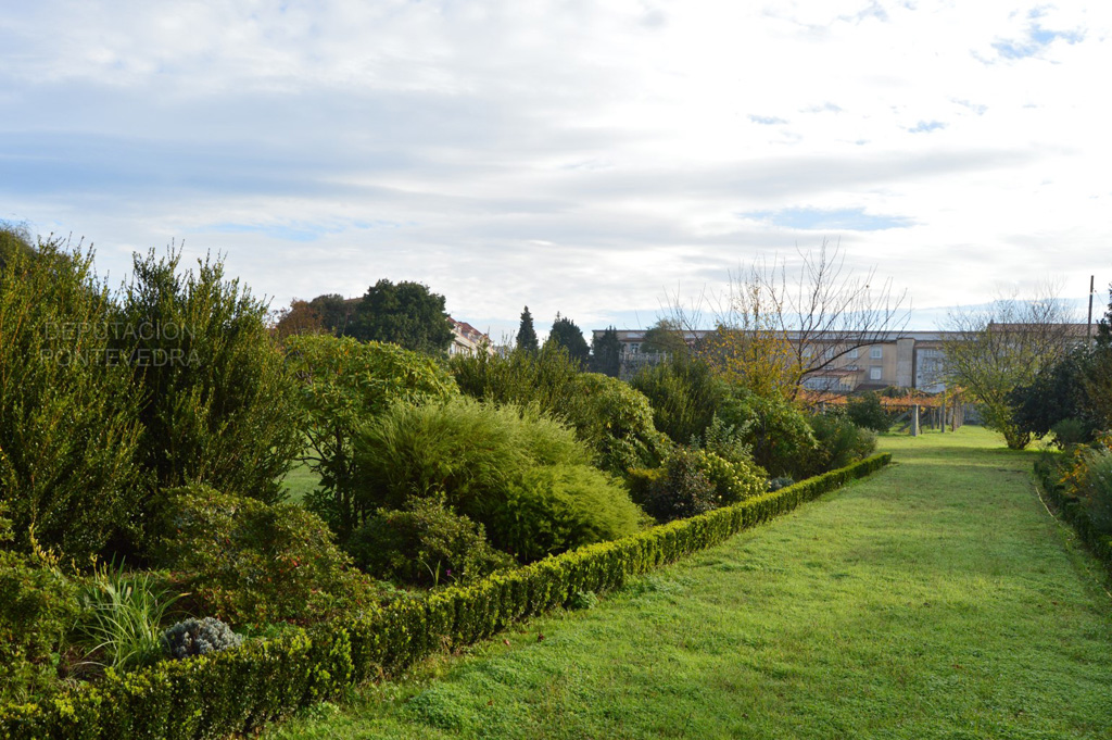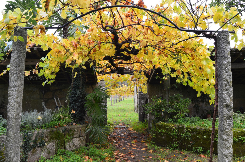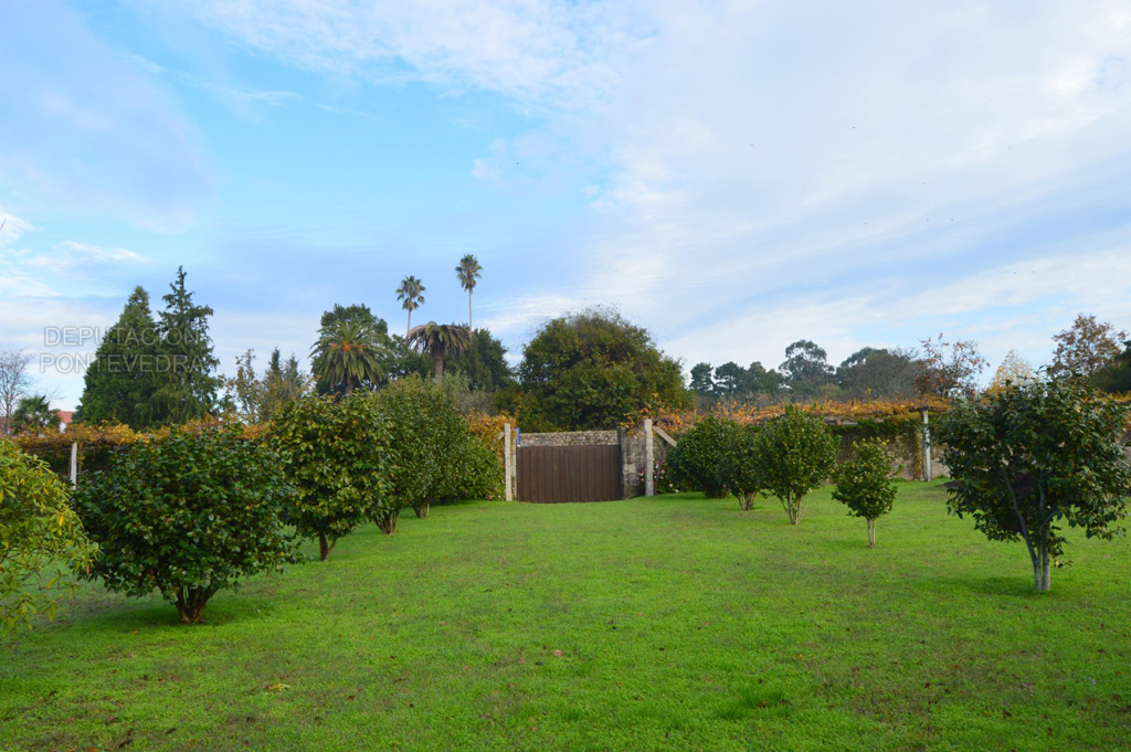 Bajando de la solana hacia la huerta amurallada, nos encontramos de frente la gran araucaria y el viñedo de albariño que rodea toda la finca, donde destacan las cepas centenarias prefiloxéricas. En medio de la huerta se encuentra un camino ajardinado con bojes, lavandas, rododendros y camelias.