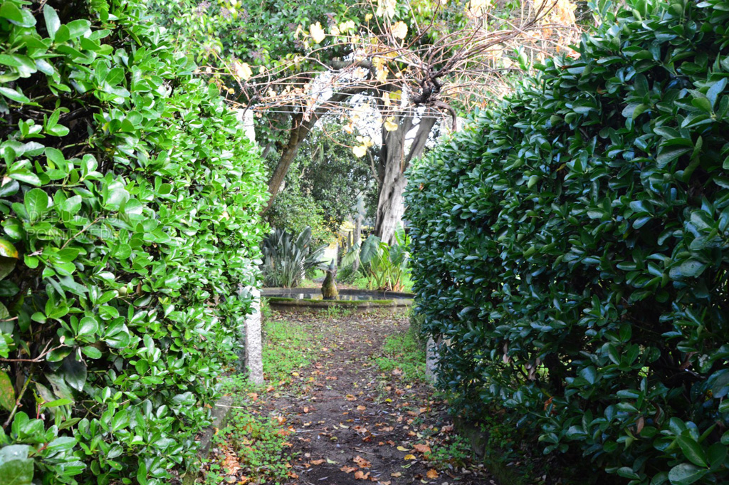 Entrando por la bodega recorremos un túnel de unos 50 metros, creado en la década de los años treinta del siglo pasado, que conduce a una primera estancia ajardinada conocida como Horta do Pombal; preside el espacio una gran araucaria de la isla de Norfolk (Araucaria heterophylla), que da comienzo a una pequeña avenida o doble alineación compuesta por arbustos de flor, entre los que destacan las hortensias (Hydrangea macrophylla), filodendros (Philodendron bipinnatifidum), brezos (Erica spp.) o rosales (Rosa banksiae 'Lutea', R. rugosa). Rodeando estos parterres crece un pequeño seto de bojes (Buxus sempevirens) podados a baja altura.