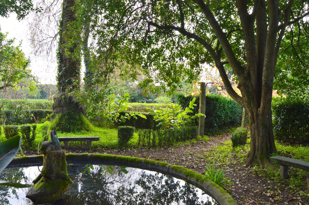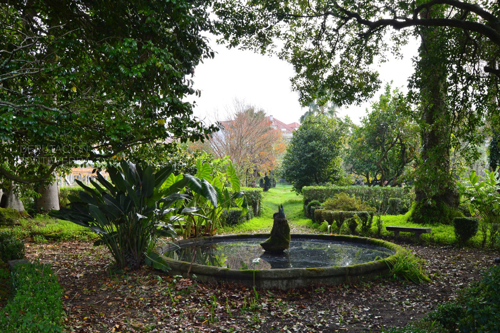 Cruzando el puente de piedra sobre la avenida de Rosalía de Castro (antiguo camino real a Caldas de Reis), se accede al segundo espacio del jardín, donde un seto de bojes forma un laberinto con un banco de piedra en su interior. También encontramos un estanque de piedra con docenas de carpas y una pareja de magnolias (Magnolia grandiflora) que presiden el espacio, así como un cordiline (Cordyline australis), camelias (Camellia japonica), o el ciprés de Lawson (Chamaecyparis lawsoniana). Siguiendo el seto de bojes se llega a uno de los lugares de mayor relevancia botánica del jardín, con dos laureles (Laurus nobilis) y dos palmeras de abanico mejicanas (Washingtonia robusta) de grandes dimensiones, que crecen alrededor del estanque y que bien se podrían incluir en el Catálogo gallego de árboles singulares. El suelo bajo las copas está cubierto de orejas de elefante (Colocasia esculenta) y aves del paraíso (Strelitzia reginae).