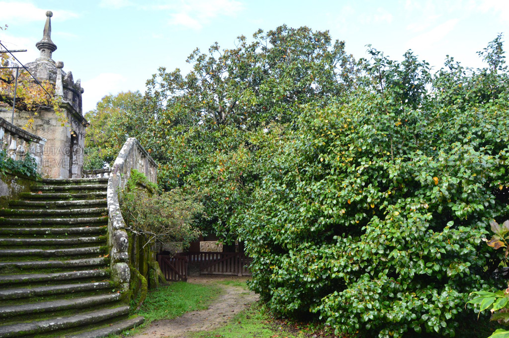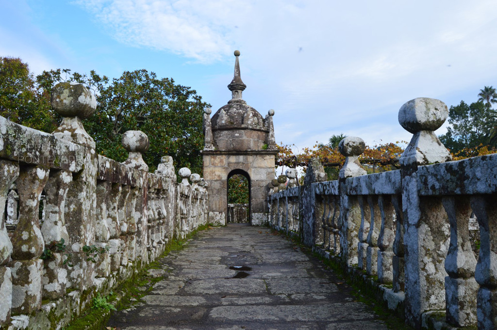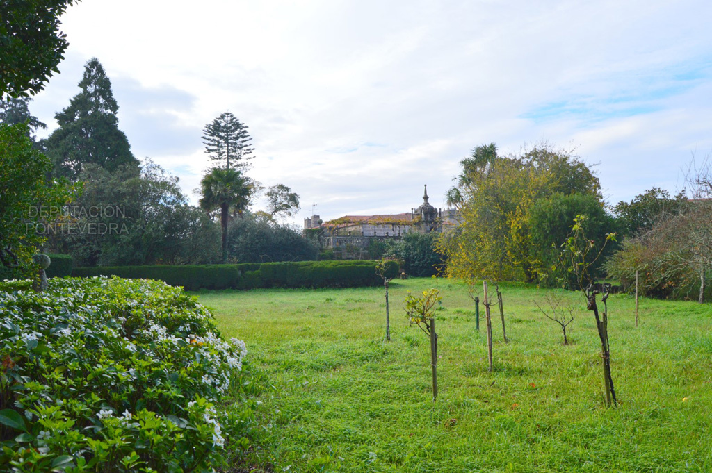 En la unión del pazo con la otra huerta un puente salva el antiguo camino real a Caldas de Reis; su rica balaustrada granítica nos permite disfrutar de las vistas sobre la iglesia y la plaza; además, comunica con la huerta grande y da acceso a una terraza con una mesa y bancos en piedra bajo cepas de albariño y a una escalera que se va abriendo en curva a medida que se desciende al jardín. Ya en esta huerta descubrimos las reminiscencias de su pasado esplendoroso; según recoge Caamaño Bournacell, cronista de Fefiñáns a mediados del siglo xx, en el xvii su frondosidad y abundancia competía con los mejores jardines de España y destacaba por la gran cantidad de frutales.